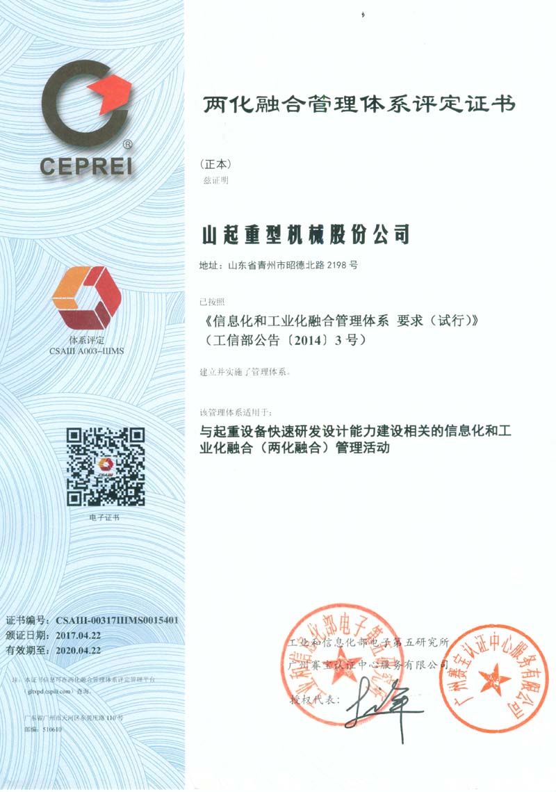國(guó)家級(jí)兩化融合貫標(biāo)試點(diǎn)企業(yè)——山起重型機(jī)械股份公司,與起重設(shè)備快速研發(fā)設(shè)計(jì)能力相關(guān)的兩化融合管理活動(dòng),現(xiàn)已通過(guò)工信部審核并獲得證書(shū)。