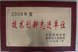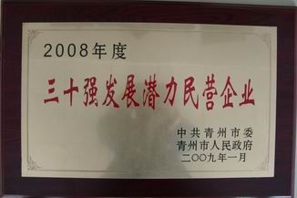 2009年2月2日,我公司在2009青州市工業(yè)振興暨招商引資動員大會上,榮獲2008年度杰出貢獻企業(yè)、技術創(chuàng)新先進單位、三十強發(fā)展?jié)摿γ駹I企業(yè)及高新技術企業(yè)等榮譽稱號。董事長徐新民榮獲“動態(tài)管理和服務企業(yè)法人代表獎”。